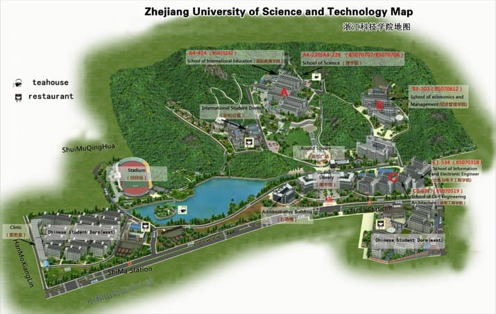 Zhejiang University of Science and Technology has two campuses. Xiaoheshan Campus is located in the historical and cultural city of Hangzhou, the capital of Zhejiang Province, which is one of the most prosperous provinces in China. Situated at the foot of Xiaohe Mountain, it has a tranquil lake on its campus and is surrounded by rolling hills; Anji Campus is situated in Anji County, which has won the United Nations’ Habitat Scroll of Honor Award. Xiaoheshan Campus is 30 minutes ride from the UNESCO World Heritage Site Westlake, 20 minutes ride from the world's largest and most valuable retailer Alibaba headquarter.